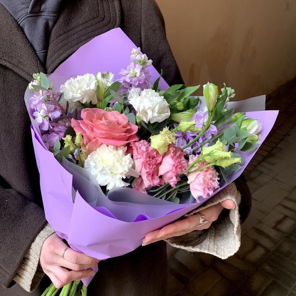 Маттиола – 3 шт.Эвкалипт – 1 шт.Альстромерия белая – 3 шт.Гвоздика белая – 3 шт.Лизиантус розовый – 1 шт.Авторская упаковка – 1 шт.роза розовая гермоза – 1 шт.
