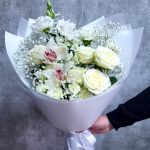 Орхидея Цимбидиум – 2 шт.Роза белая – 5 шт.Роза кустовая – 2 шт.Альстромерия – 1 шт.Гвоздика – 3 шт.Лизиантус – 1 шт.Гипсофила – 2 шт.Упаковка дизайнерская – 1 шт.