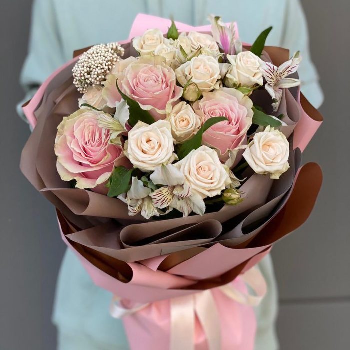 кустовая роза порцелина – 3 шт. Альстромерия – 2 шт. Роза пинк мондиаль – 3 шт. Озотамнус – 1 шт. Оформление – 1 шт.