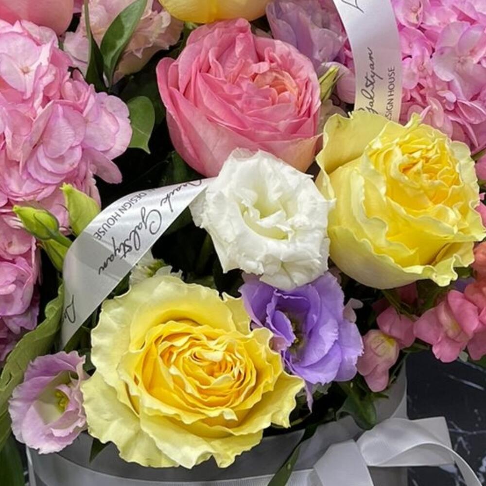Нежная, зефирная, пушистая коробка с гортензиями и розами обрадует любую. А лизиантусы придадут дню хорошее настроение и позитивный день.