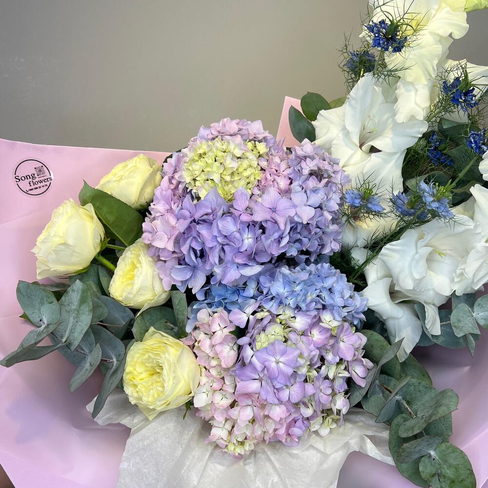 Гвоздики, Кустовые розы, Лизиантусы, Пионовидные розы, Розы