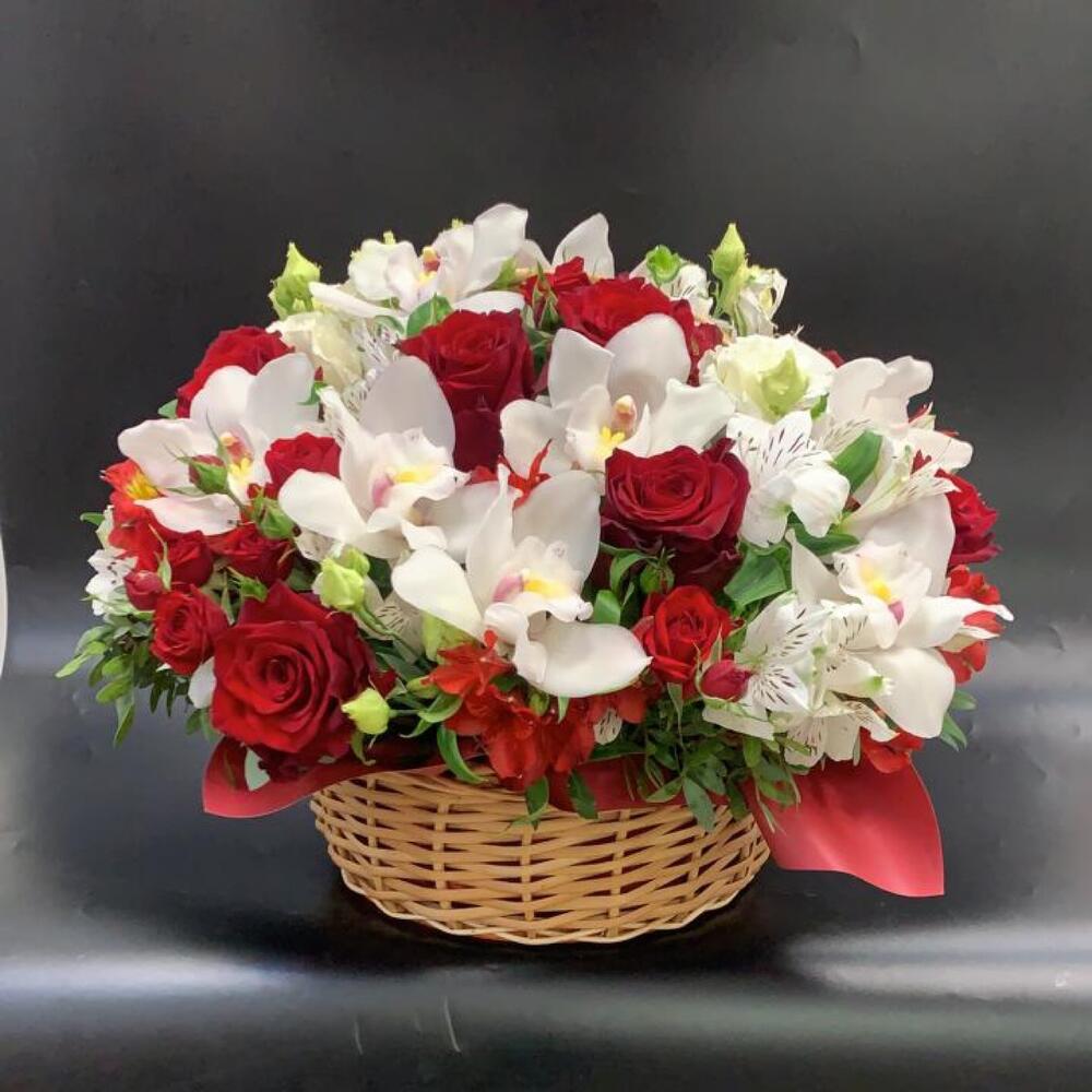 Корзина плетеная – 1 шт.Оазис флористический – 1 шт.Орхидея белая – 9 шт.роза ред наоми. – 9 шт.альстромерия микс – 6 шт.Роза кустовая красная – 2 шт.Лизиантус – 2 шт.лист фисташки – 5 шт.пленка корейская дизайнерская – 1 шт.