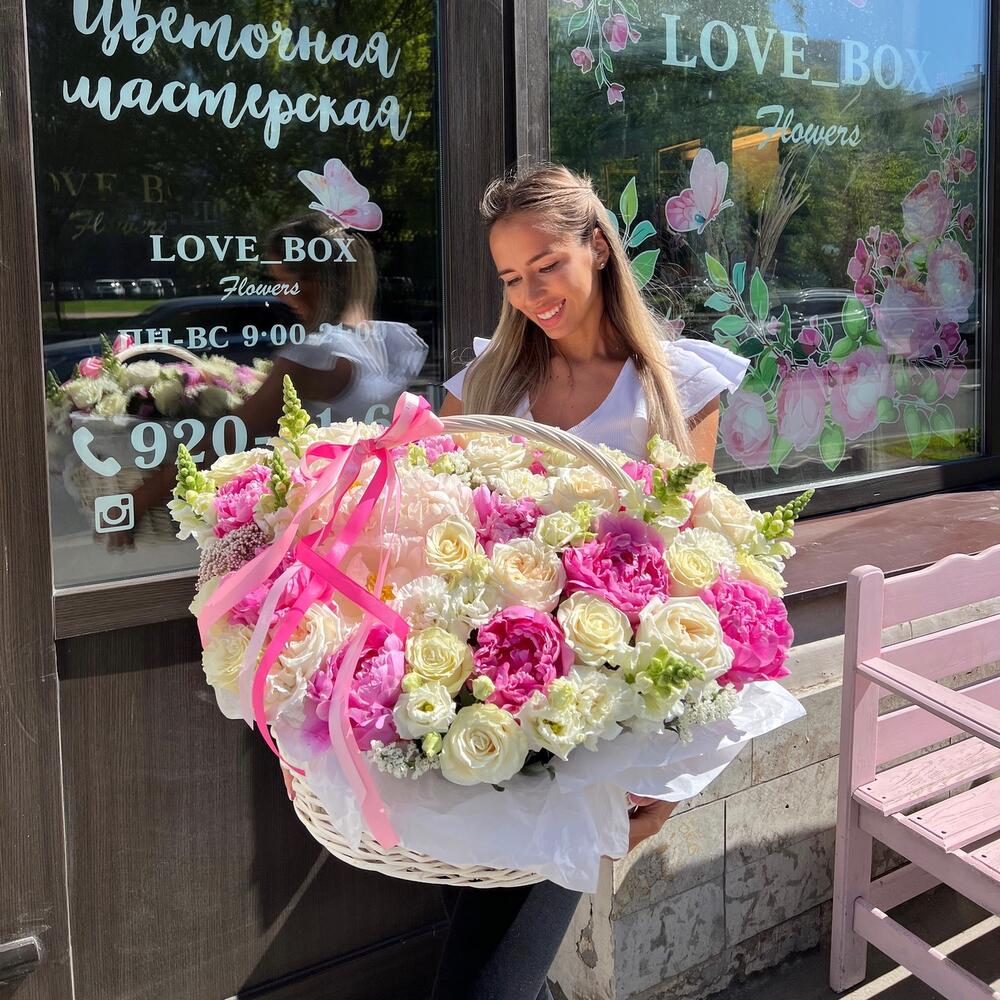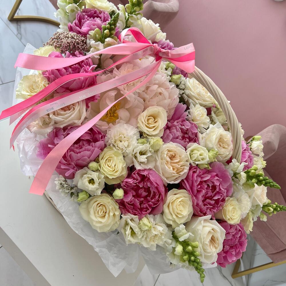 Пион – 10 шт.Лизиантус – 7 шт.Диантус – 8 шт.Роза Эквадор – 15 шт.Роза пионовидная – 6 шт.Корзина плетеная – 1 шт.Оазис флористический – 5 шт.Статица – 5 шт.